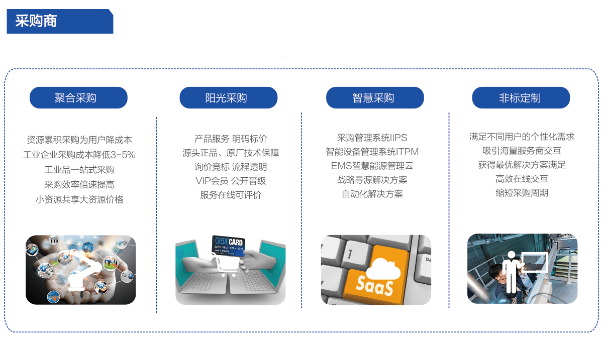 4000余家优质供应商资源,涉及模具制造、工业机器人、动力传动、电子电气、气动液压、工业设备、五金工具、办公劳保、化工产品、消防安全等二十大品类及企业培训、产业链金融、人力资源等服务领域。